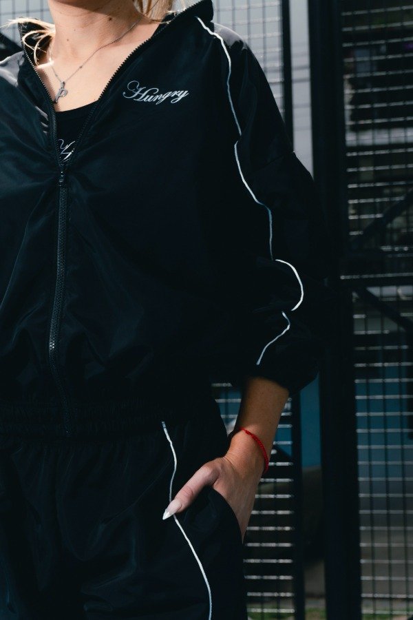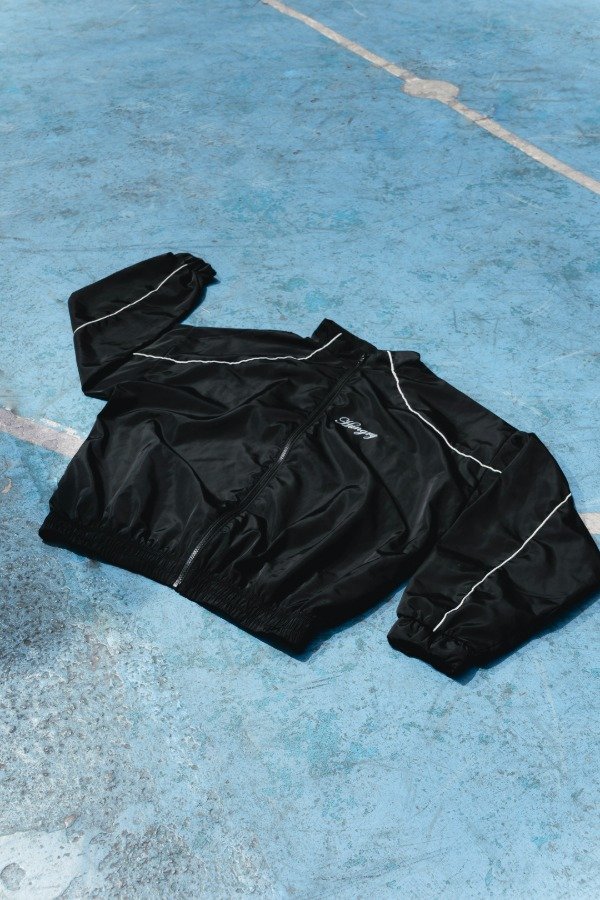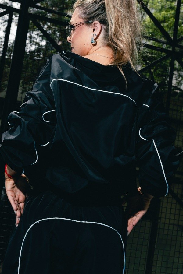 Campera liviana de nylon con detalles en vivo, cierre desmontable y logo.